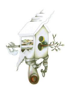 2022Een fantasietekening in potlood en kleurpotlood waarbij is associatief heb gewerkt. Het is een vogelhuisje en er steekt inderdaad een soort vogelpoot uit, en onderaan kijkt een oog je aan, maar verder is er niet echt een vogel te zien. Wel een mysterieus landschap in het midden. De precieze betekenis mag je geheel zelf invullen.