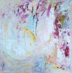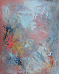 2020Dit schilderij vormt een echte blikvanger in iedere kamer, maar op een zachte manier. Het werk is expressief in diverse tinten roze, magenta, oker en turquoise geschilderd. De opbouw in diverse lagen wekt de suggestie van een andere dimensie die zich achter het doek bevindt. Ook bijzonder is de kleine roodbruine plek rechtsboven, dat is echte roest.