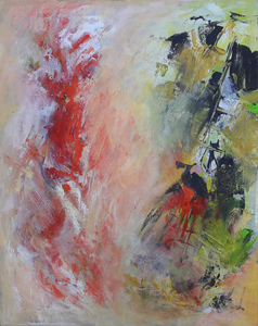 2020Dit schilderij roept een gevoel op van actie, beweging en veel dynamiek. Op het eerste gezicht zijn er vooral felle kleurcontrasten, tussen het zwart, rood, groen en beige, maar op het tweede gezicht zitten er ook veel subtiele kleurnuances in. Een schilderij waar je lang naar kunt blijven kijken.
